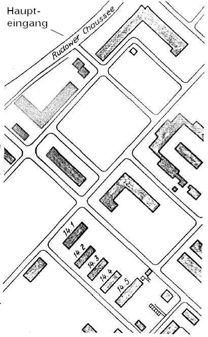 Bild 2: Stammsitz des ZKI in Berlin waren zwischen 1972 und 1981 fünf Baracken (14.1 bis 14.5) in Berlin-Adlershof, Rudower Chaussee 5 (Südgelände). Rechtes Bild: Auszug Google-Maps 2020.